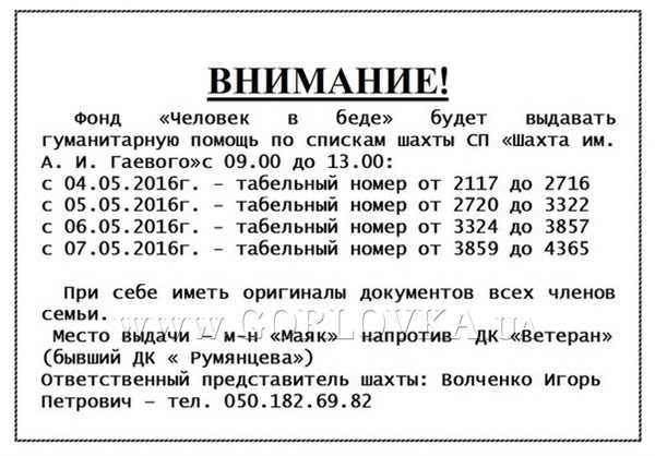 Объявление о выдаче продуктовых наборов разместила администрация шахты им. А. И. Гаевого.