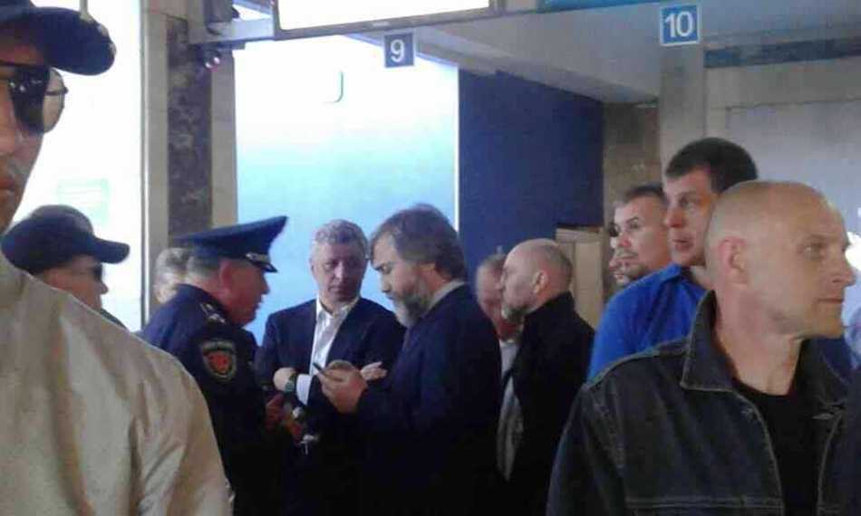 Часть зала ожидания одесского аэропорта блокирована из-за приезда нардепов из "Оппозиционного блока" Вадима Новинского и Юрия Бойко. Часть терминала аэропорта оказалась заблокирована из-за охраны политиков. Активисты "Автомайдана" не пускают их в Одессу.