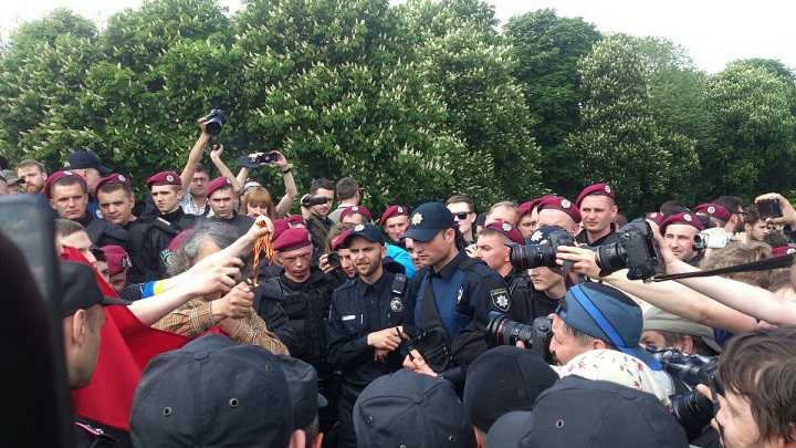 Правоохранители пытались локализовать "правосеков", окружив место проведения их акции. Представители "Правого сектора" вступили в потасовку с правоохранителями, прорвали кольцо оцепления и продолжили акцию на аллеях парка.