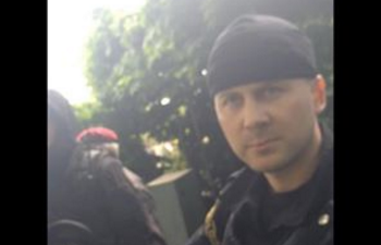 Сегодня, 9 мая, в Киеве во время шествия «Бессмертного полка» правоохранители едва не задержали участника боевых действий в зоне АТО Виталия Овчаренко, который попытался отобрать красный флаг у одного из участников акции.