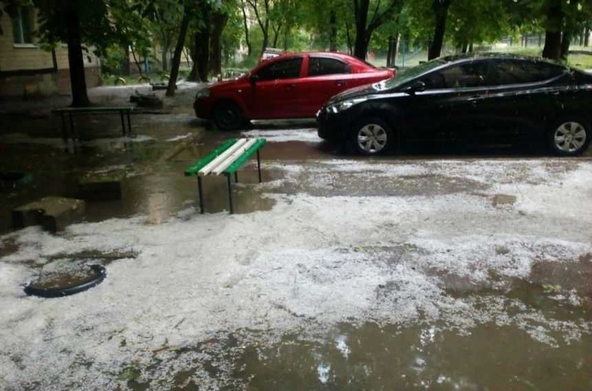 Вчера районы Днепропетровска обильно поливало дождем и засыпало градом. В огромных глубоких лужах утопали не только люди, но и городской транспорт.