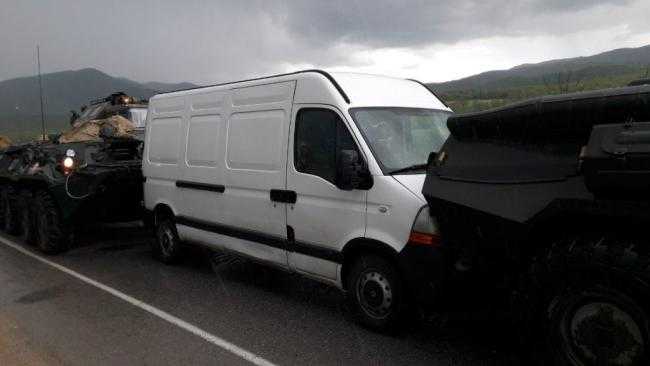 Как передает Четвертая власть со ссылкой на российские СМИ, виновником ДТП стал один из водителей БТРа, который наехал задом на микроавтобус.