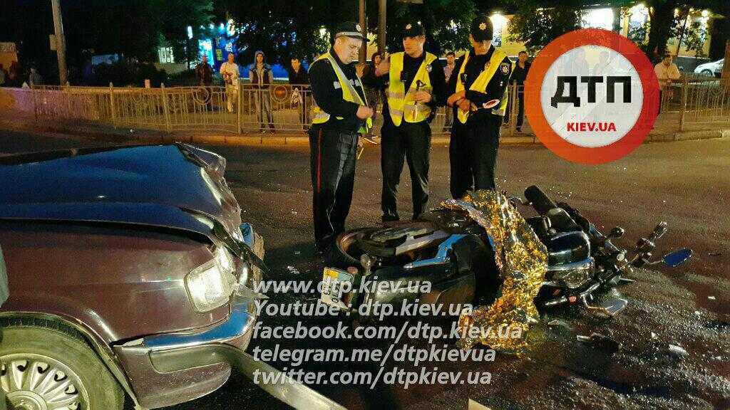 По предварительным данным, пилот мотоцикла, двигавшийся без шлема, ехал со стороны ст. м. Петровка. На перекрёстке мотоциклист поехал на запрещающий сигнал светофора и врезался в автомобиль "Волга", который поворачивал на ул. Ольжича.