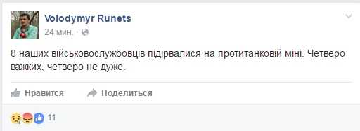 "8 наших военнослужащих подорвались на противотанковой мине. Четверо тяжелых, четверо не очень", - написал журналист.