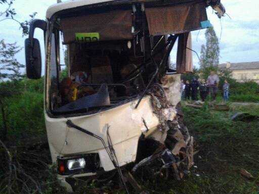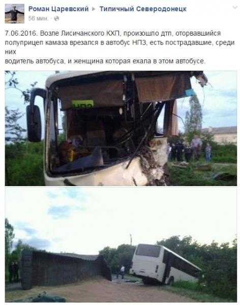 "7.06.2016. Возле Лисичанского КХП, произошло дтп, оторвавшийся полуприцеп камаза врезался в автобус НПЗ, есть пострадавшие, среди них водитель автобуса, и женщина которая ехала в этом автобусе", - сказано в сообщении и опубликованы снимки.