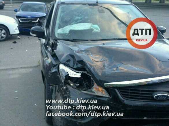Вечером 9 июня в Киеве на улице Набережно-Корчеватской Форд протаранил Киа и отбросил его на Рено.