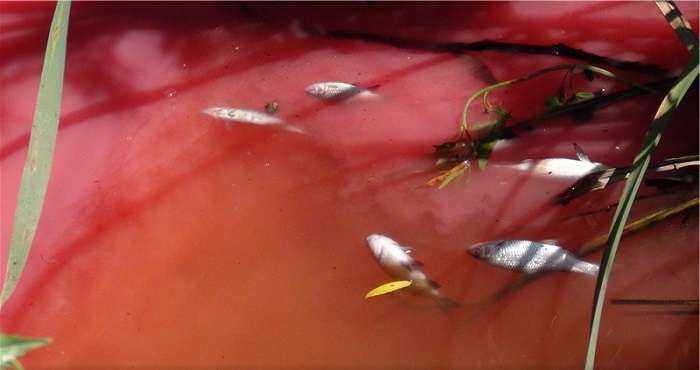 На реке Стугна жители Василькова заметили большое красное пятно, что расползалась от берега вниз по течению. От него доносился ужасный запах ацетона, как от краски. Рыба на пораженном участке реки сразу же погибла.