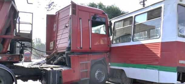 Зерновоз ехал по ул. Пушкинской со стороны Пушкинского кольца в направлении ул. Чигрина. На пересечении с ул. Буденного, справа по ходу движения зерновоза выехал трамвай. Водитель большегрузного автомобиля пытался тормозить, однако все же врезался в вагон.