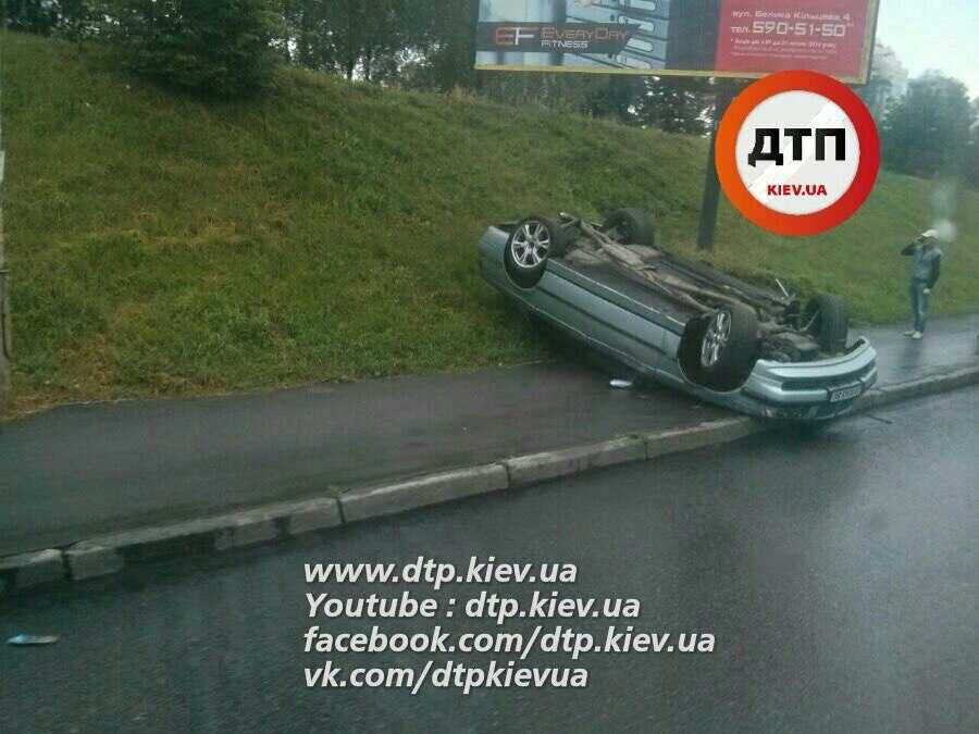 В Киеве на мокрой дороге не справился с управлением водитель автомобиля "BMW". Машина перевернулась на крышу, а два человека с травмами попали в больницу.