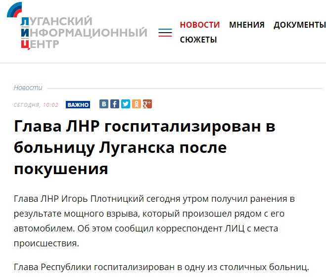 Главарь "ЛНР" Игорь Плотницкий утром 6-го августа получил ранения в результате мощного взрыва, который прогремел рядом с его автомобилем.