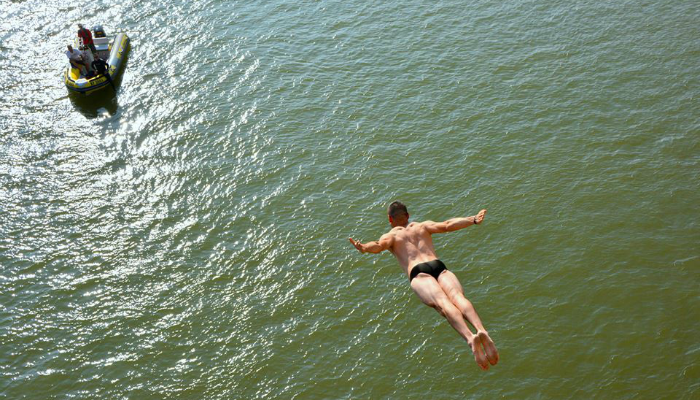 Спортсмен совершил прыжок с высоты почти 20 метров. За его трюком наблюдала толпа людей. Беюц на мосту поздоровался с поклонниками, после чего прыгнул в реку.