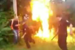 Полицейские пытались выбить горящую бутылку из рук хулигана, но он внезапно бросил ее в них. Моментально вспыхнуло пламя, благо полицейские успели увернуться и избежать серьезных последствий. После этого мужчину задержали.