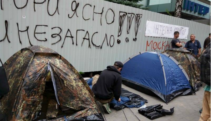 Более сотни участников протеста установили палатки под офисом телеканала "Интер".