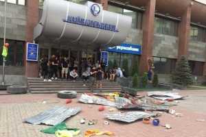 Группа активистов гражданского корпуса плотным строем стала около главного входа организации, остальные активисты забрасывают здание дымовыми шашками.