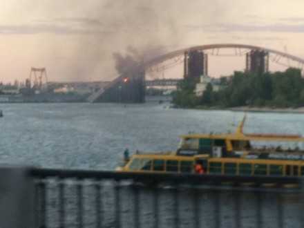 Недостроенный Подольский мост загорелся в Киеве. На месте происшествия находятся две пожарные машины и одна "скорая".