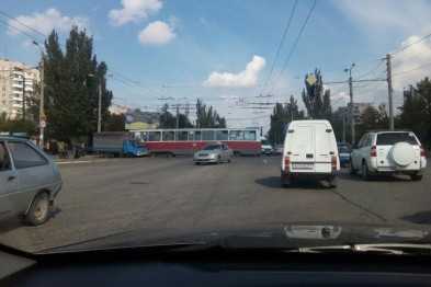 На трамвайном полотне не разъехался трамвай №8 и автомобиль «FAW» синего цвета. Произошло лобовое столкновение.
