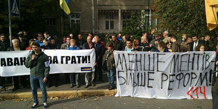 Сегодня, 6 октября, активисты "Правого сектора", Всеукраинского объединения "Свобода" и ОУН затеяли под зданием Министерства внутренних дел в Киеве акцию протеста.