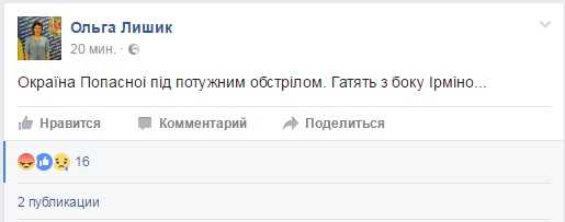 "Окраїна Попасноі під потужним обстрілом. Гатять з боку Ірміно..." - пишет Ольга Лишик.
