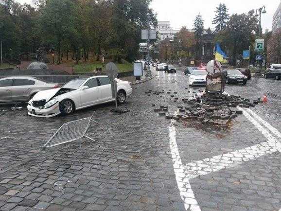 На улице Грушевского в Киеве водитель автомобиля "Mercedes" не справился с управлением и на скорости врезался в памятник герою Небесной сотни, зацепив автомобиль "Volkswagen". Машины получили повреждения, памятник разрушен.