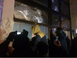 Войдя в азарт, протестующие начали крушить все, что попадалось им под руку. Вскоре на место событий подтянулись сотрудники полиции и оттеснили митингующих от стен здания.