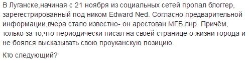 "В Луганске,начиная с 21 ноября из социальных сетей пропал блоггер, зарегистрированный под ником Edward Ned. Согласно предварительной информации,вчера стало известно- он арестован МГБ лнр. Причём, только за то,что периодически писал на своей странице о жизни города и не боялся высказывать свою проукранскую позицию.