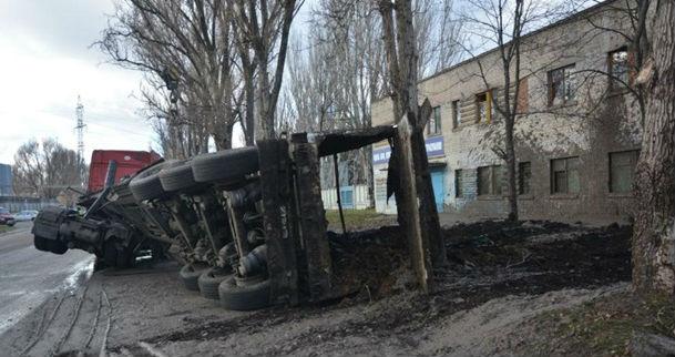 В городе Каменское (бывший Днепродзержинск) произошла авария, в результате которой перевернулся тягач "DAF", груженный жидкими свиными фекалиями. 20 тонн "ароматного" груза хлынули на дорогу и тротуар.