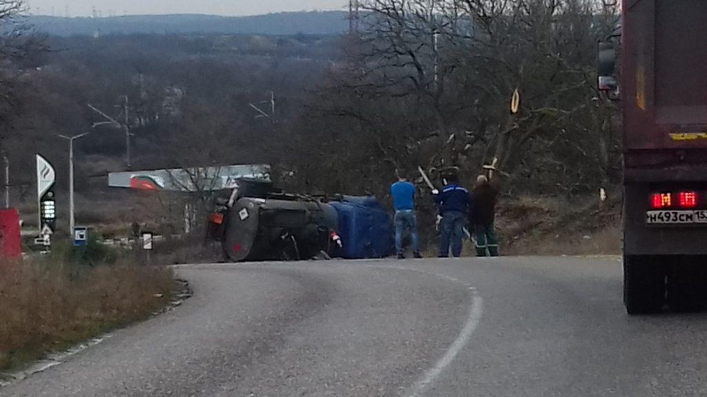 В Севастополе на Мекензиевых горах перевернулся бензовоз. Инцидент произошел в районе железнодорожного переезда.