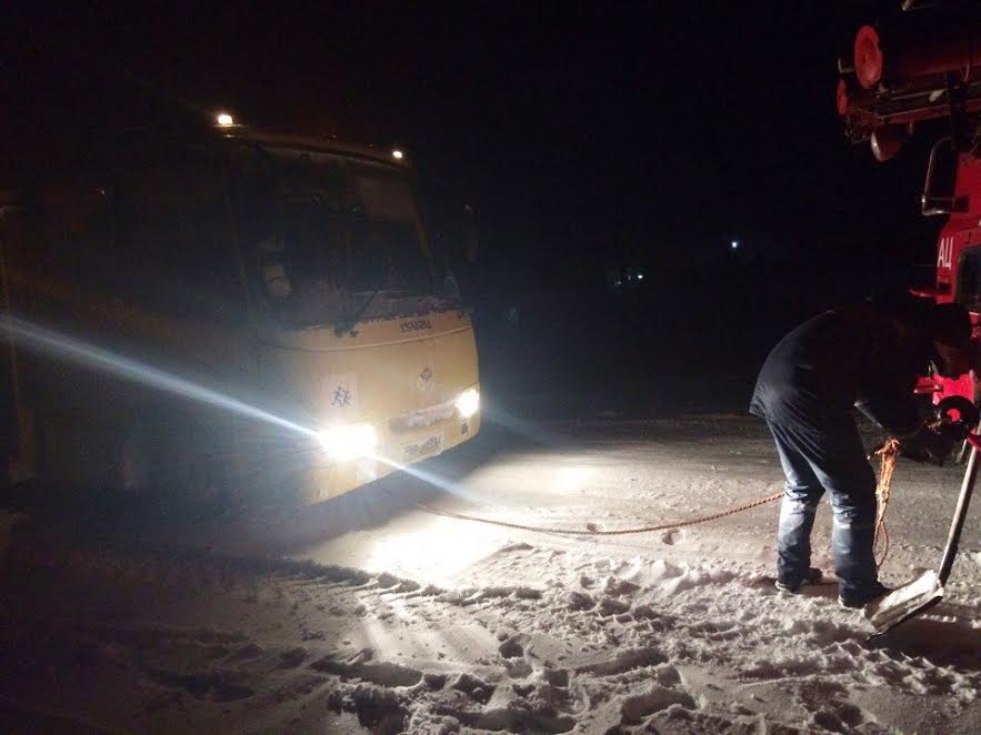 Спасатели вызволили из снежного плена школьный автобус, где находились дети.