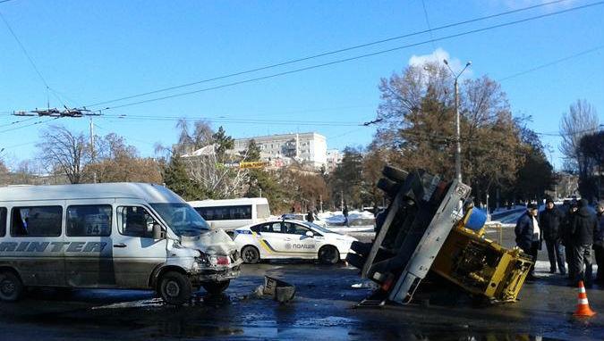 В центре Запорожья столкнулись маршрутка и автовышка, в результате есть пострадавшие.