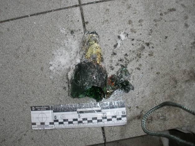 Осмотрев место происшествия, вблизи входа в помещение общественной организации полиция изъяла остатки стеклянной бутылки. Согласно акту специалистов Научно-исследовательского экспертно-криминалистического центра, следов взрыва или взрывчатых веществ не обнаружено. Изъятое направили на проведение экспертизы.