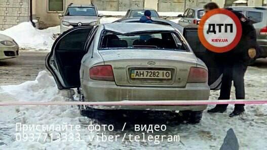 В украинской столице снежная глыба раздавила автомобиль, припаркованный посреди двора. В результате ЧП водитель не пострадал.