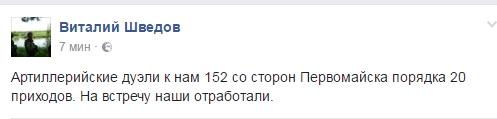 "Артиллерийские дуэли к нам 152 со стороны Первомайска порядка 20 приходов. На встречу наши отработали".