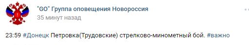 "23:59 #Донецк Петровка(Трудовские) стрелково-минометный бой", "И с Донецка и с Луганска наши насыпали от души" - сказано в сообщениях сепаратистской группы ВКонтакте.