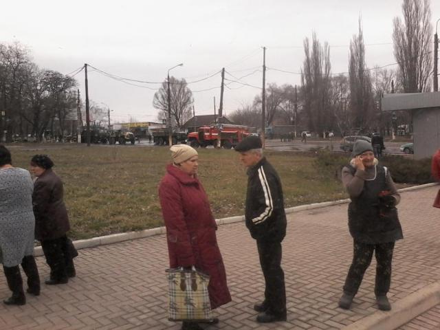 С места происшествия уже есть первые фото, и на них не видно больших последствий взрыва и пожара. Также не заметно и оцепление: люди достаточно свободно передвигаются в зоне предполагаемого взрыва. Боевики не препятствуют их скоплению.