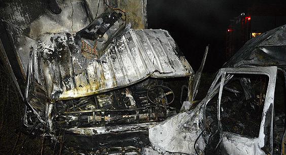 В результате столкновения транспортные средства cъехали в кювет и загорелись.