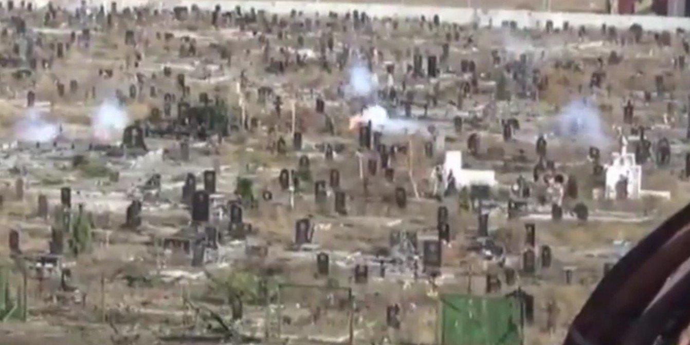 На видео видно практически полностью разрушенное расположенное рядом с монастырем кладбище.