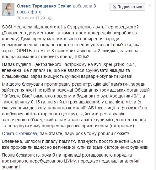Добавим, экс-депутат Киевсовета Елена Терещенко-Ескина также считает, что здание гастронома подожгли умышленно. Об этом она написала у себя в Фейсбуке.