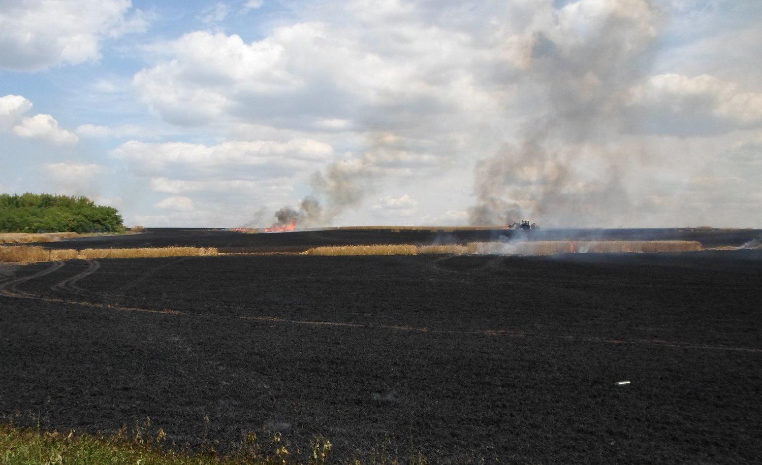 По прибытию к месту вызова пожарными было установлено, что пожаром уже уничтожено около 60 га посевов, вместе с этим, на поле с пшеницей наблюдалось еще 4 очага пожара общей площадью 1 га. Вероятной причиной возгорания пшеницы стали боевые действия, происходящие в непосредственной близости от населенного пункта.