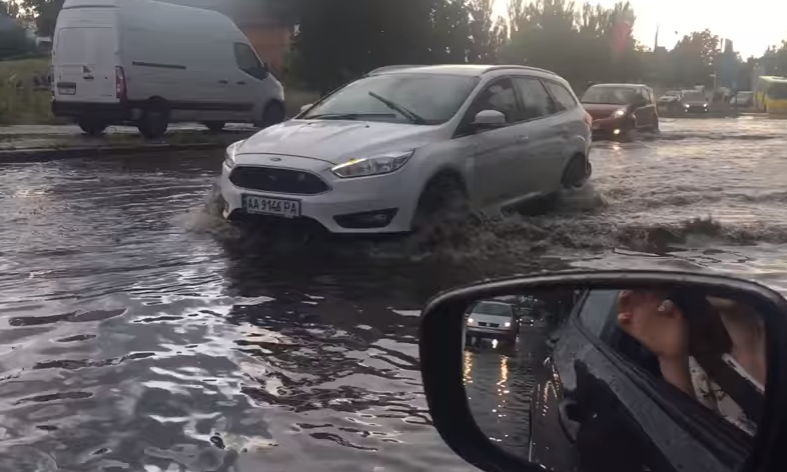 Вчера, 27 июля, в Киеве прошел сильный ливень, в результате чего дорожное движение по улицам столицы превратилось в форсирование водных преград. Из-за дождя на Борщаговке размыло грунт и образовался провал.