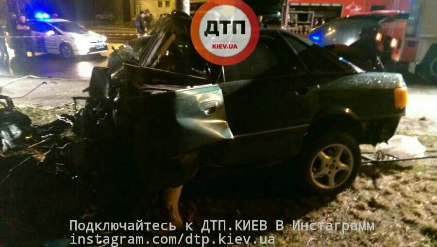 "Первые фото с места жуткого ночного ДТП с трупами в Киеве на Юности. Ауди уничтожился о столб. Оба пассажира вылетели из авто. Обломки улетели вперед на 70 метров... Водитель и пассажир, сидевший рядом, погибли на месте.