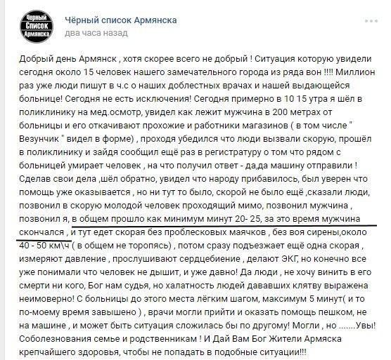 "Очевидно уже, что скорые в Крыму получают премии в рамках программы Умереть в Росии", - написала в Твиттере блогер RoksolanaToday&Крым, которая поделилась скриншотом из паблика Армянска.