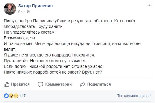 Российские СМИ распространили информацию о гибели в зоне АТО на Донбассе российского актера Анатолия Пашинина. Информацию о смерти мужчины, воюющем на стороне Украине, ранее опубликовал в Фейсбуке боевик «ДНР» Захар Прилепин.
