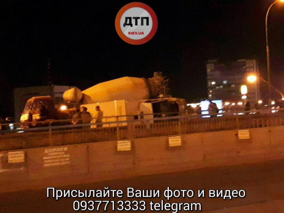 В сообщении говорится , что столкнулись три автомобиля: грузовик, бетономешалка и легковой автомобиль. От удара грузовик опрокинуло на бок. Из-за аварии было полностью перекрыто движение. Образовалась очень большая пробка. Подробности происшествия и детальная информация о пострадавших уточняются.