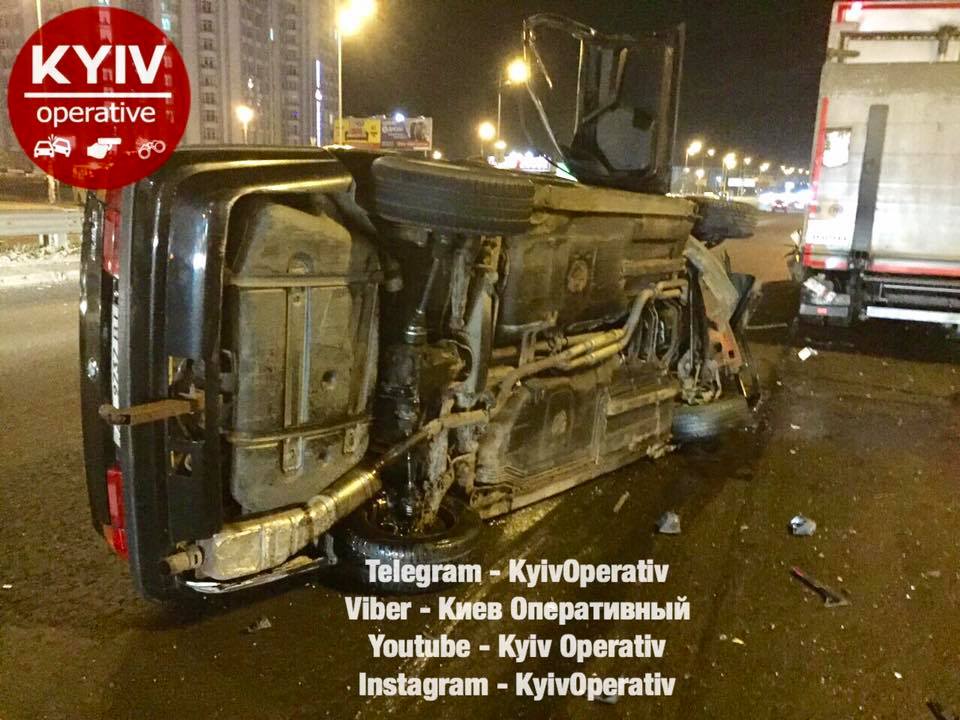 Около 21:00 на проспекте Бажана, возле метро Осокорки, водитель автомобиля BMW, г.н.з. AI9737BI, не справился с управлением и въехал в грузовик. После удара BMW перевернулся на бок и улетел через несколько рядов.