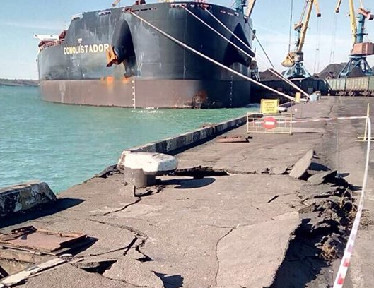 В порту "Южный", расположенном недалеко от Одессы, грузовой корабль протаранил причал и повредил его.