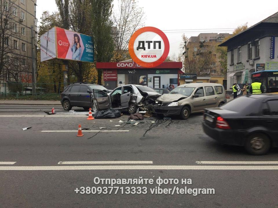 Киеве столкнулись три легковых автомобиля, в результате чего один мужчина погиб на месте, второй госпитализирован, передает Час Пик со ссылкой на dtp.kiev.ua.