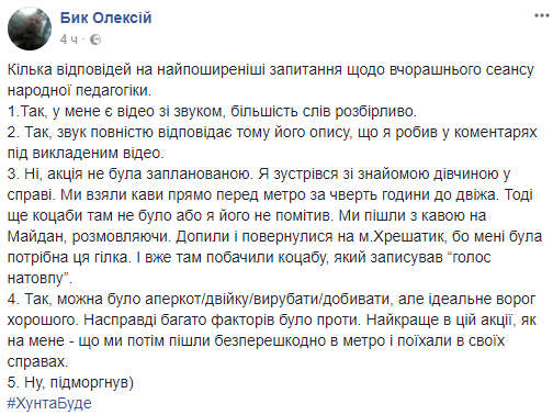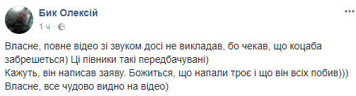 Сначала Бык выложил видео без звука, как он позже пояснил – потому что ожидал, что Коцаба заврется. Сам пропагандист заявил, что вместе с Быком на него якобы напали еще два человека. Коцаба написал заявление в полицию.