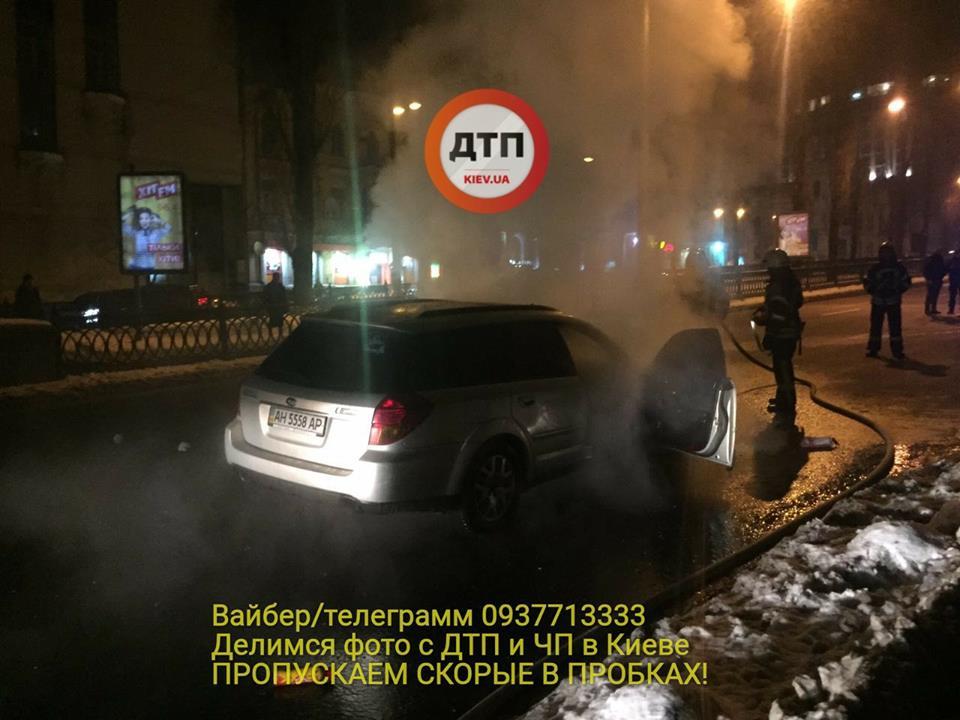 "Взрыв и пожар Субару в Киеве на бульваре Шевченко: по словам свидетелей водитель Субару остановился, после чего последовал сильный хлопок, который вырвал капот и разворотил крылья авто. Начался пожар. Водитель не получил тяжелых травм.