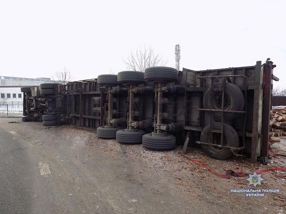 Как предварительно установили полицейские, водитель автопоезда «ДАФ 95ХС», 51-летний житель города Житомир, не справился с управлением, вследствие чего грузовик перевернулся и рассыпалась лесопродукция, которую он перевозил.