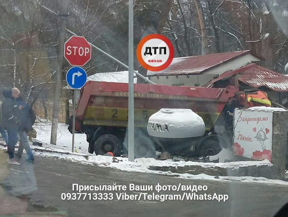 На фото, опубликованном в сети видна табличка ресторана "Запрошуємо на пікнік" и попавший в ДТП автомобиль, который занимается доставкой песка и щебня.